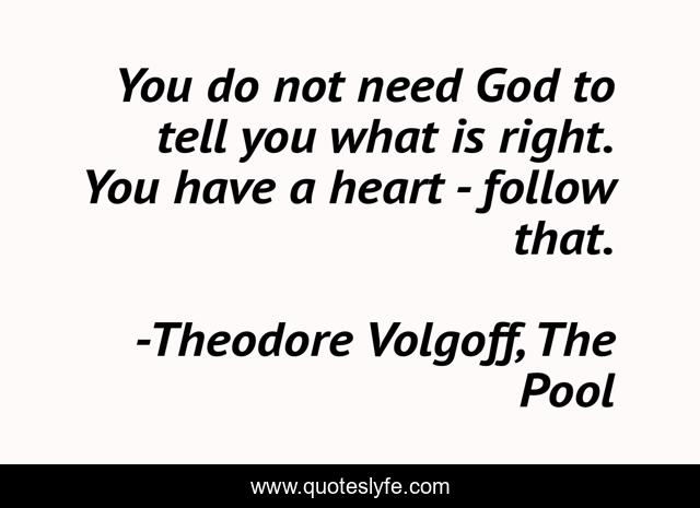 This page presents the quote "You do not need God to tell you what is right. You have a heart - follow that.". Author of this quote is Theodore Volgoff, The Pool. This quote is about god, heart,.