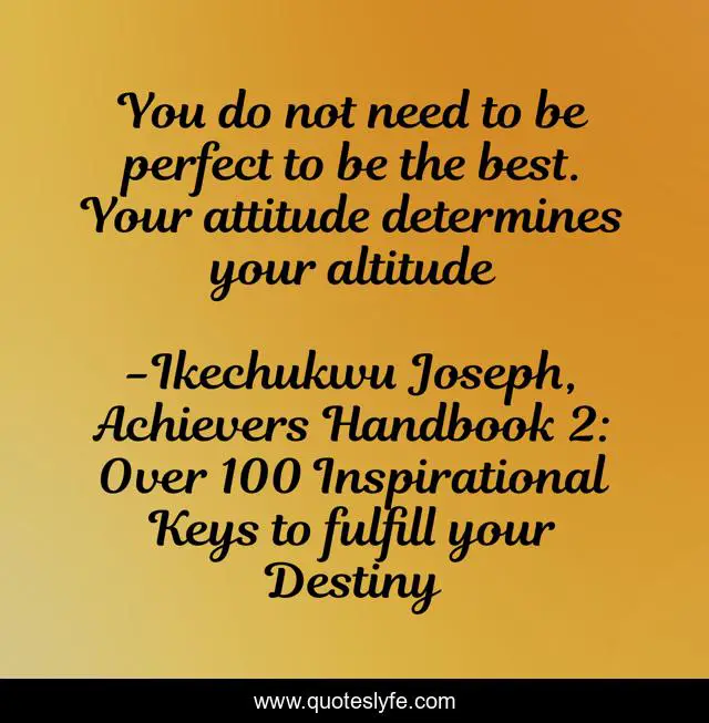 This page presents the quote "You do not need to be perfect to be the best. Your attitude determines your altitude". Author of this quote is Ikechukwu Joseph, Achievers Handbook 2: Over 100 Inspirational Keys to fulfill your Destiny. This quote is about achievers, christian, success,.