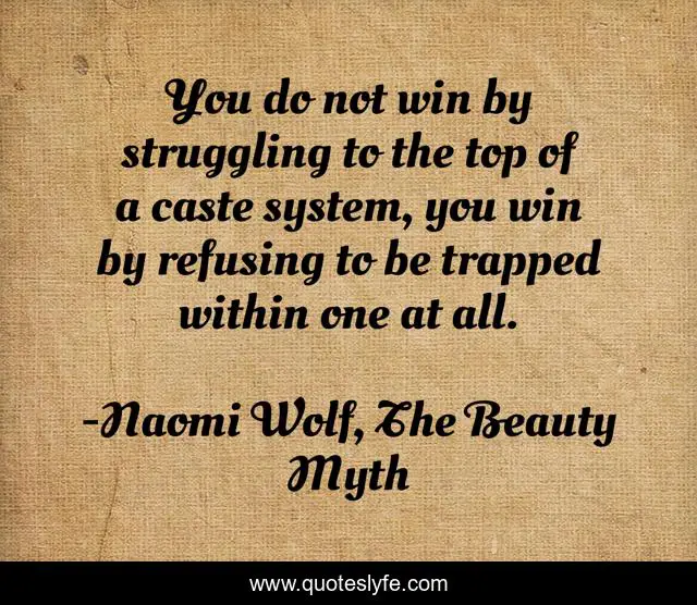 This page presents the quote "You do not win by struggling to the top of a caste system, you win by refusing to be trapped within one at all.". Author of this quote is Naomi Wolf, The Beauty Myth. This quote is about empowerment, dissent, defiance, behaviour, attitude, freedom, social-order, critical-thinking,.