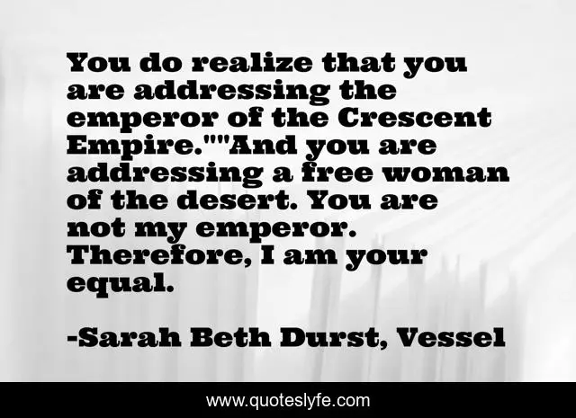 This page presents the quote "You do realize that you are addressing the emperor of the Crescent Empire.""And you are addressing a free woman of the desert. You are not my emperor. Therefore, I am your equal.". Author of this quote is Sarah Beth Durst, Vessel. This quote is about spunk, girl-power, courage, logic, liyana, emperor, bravery,.