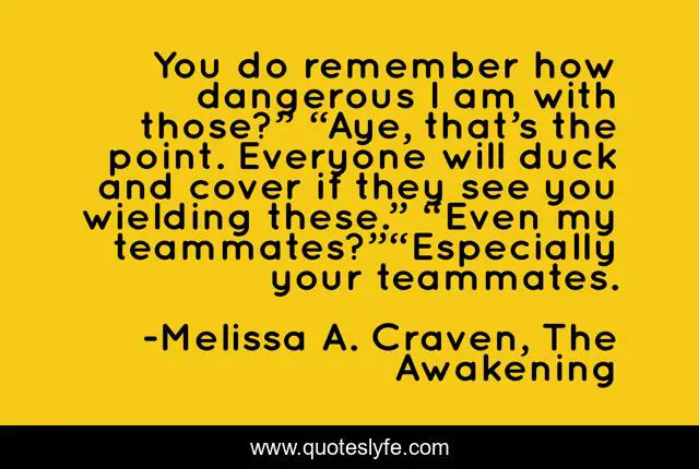This page presents the quote "You do remember how dangerous I am with those?” “Aye, that’s the point. Everyone will duck and cover if they see you wielding these.” “Even my teammates?”“Especially your teammates.". Author of this quote is Melissa A. Craven, The Awakening. .