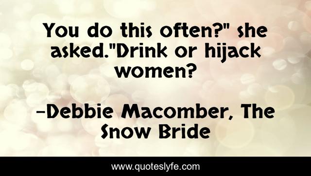 This page presents the quote "You do this often?" she asked."Drink or hijack women?". Author of this quote is Debbie Macomber, The Snow Bride. This quote is about alaskan-romance, contemporary-romance, snow, alaska,.