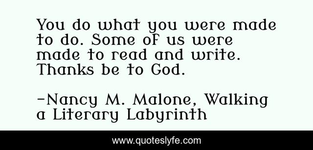 This page presents the quote "You do what you were made to do. Some of us were made to read and write. Thanks be to God.". Author of this quote is Nancy M. Malone, Walking a Literary Labyrinth. This quote is about reading, writing,.