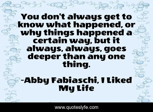 This page presents the quote "You don't always get to know what happened, or why things happened a certain way, but it always, always, goes deeper than any one thing.". Author of this quote is Abby Fabiaschi, I Liked My Life. This quote is about insightfult, life-lessons,.
