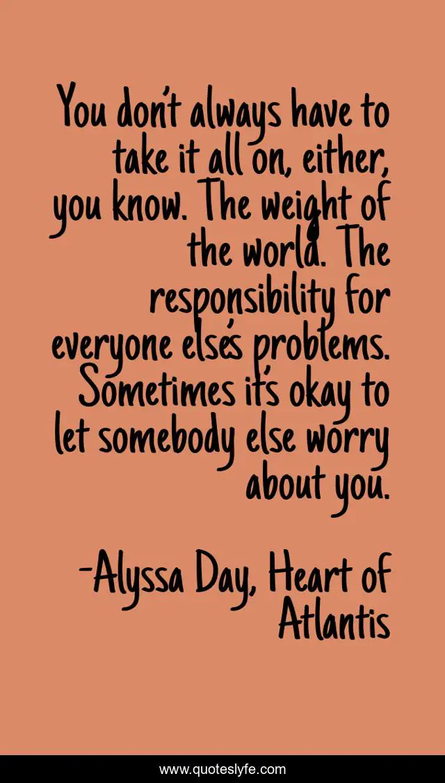This page presents the quote "You don’t always have to take it all on, either, you know. The weight of the world. The responsibility for everyone else’s problems. Sometimes it’s okay to let somebody else worry about you.". Author of this quote is Alyssa Day, Heart of Atlantis. This quote is about heart, atlantis, alyssa, day, of,.