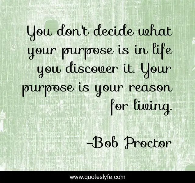 This page presents the quote "You don't decide what your purpose is in life you discover it. Your purpose is your reason for living.". Author of this quote is Bob Proctor. This quote is about personal-development, living, purpose, personal-growth,.