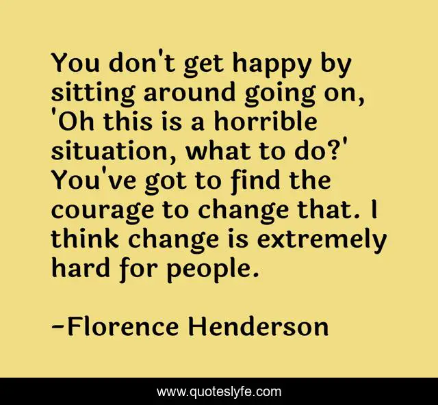 This page presents the quote "You don't get happy by sitting around going on, 'Oh this is a horrible situation, what to do?' You've got to find the courage to change that. I think change is extremely hard for people.". Author of this quote is Florence Henderson. This quote is about happy, change, people,.