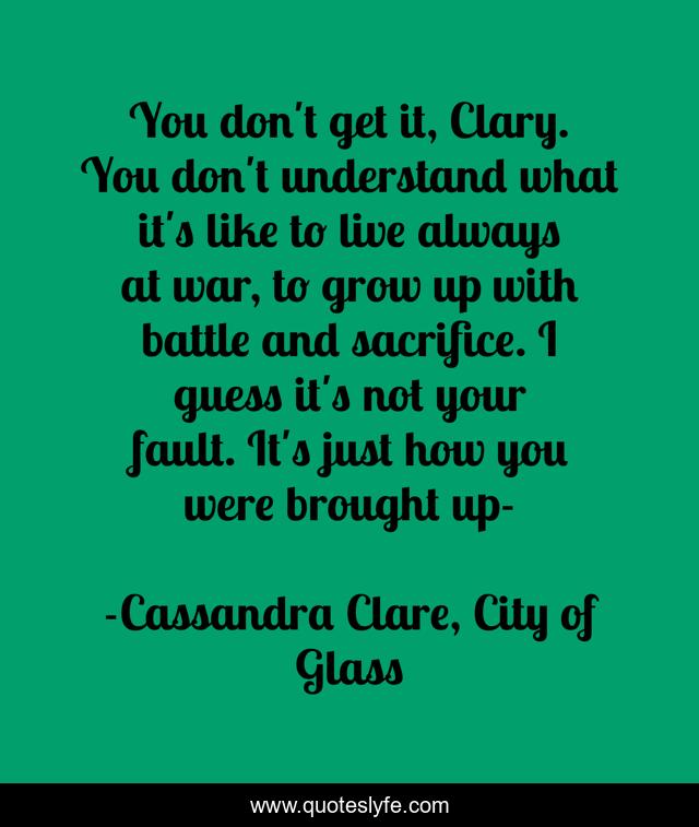 This page presents the quote "You don't get it, Clary. You don't understand what it's like to live always at war, to grow up with battle and sacrifice. I guess it's not your fault. It's just how you were brought up-". Author of this quote is Cassandra Clare, City of Glass. This quote is about life, city-of-glass, sacrifice, mortal-instruments, isabelle-lightwood, battle, war,.