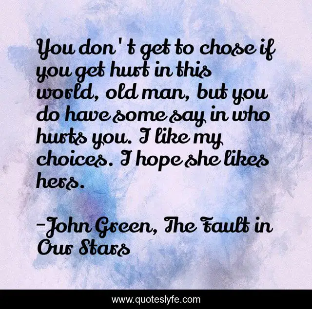 This page presents the quote "You don't get to chose if you get hurt in this world, old man, but you do have some say in who hurts you. I like my choices. I hope she likes hers.". Author of this quote is John Green, The Fault in Our Stars. This quote is about loss, love, hope, affection, choices,.