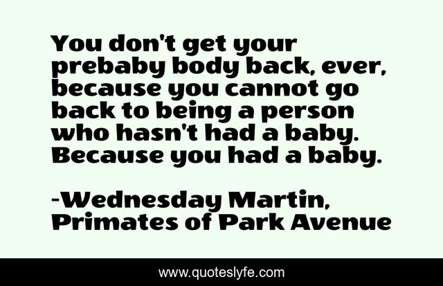 This page presents the quote "You don't get your prebaby body back, ever, because you cannot go back to being a person who hasn't had a baby. Because you had a baby.". Author of this quote is Wednesday Martin, Primates of Park Avenue. .