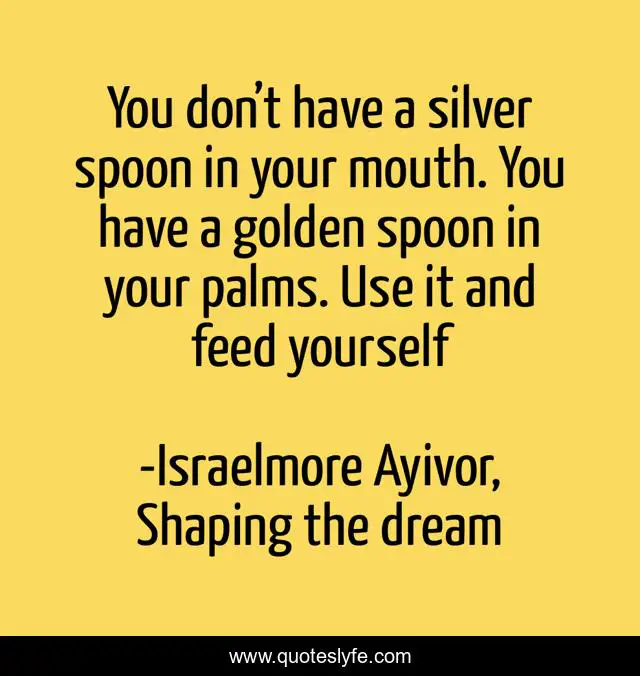 This page presents the quote "You don’t have a silver spoon in your mouth. You have a golden spoon in your palms. Use it and feed yourself". Author of this quote is Israelmore Ayivor, Shaping the dream. This quote is about golden, food-for-thought, diamond, hard-work, gold, diligence, work, silver-spoon, feed-yourself,.