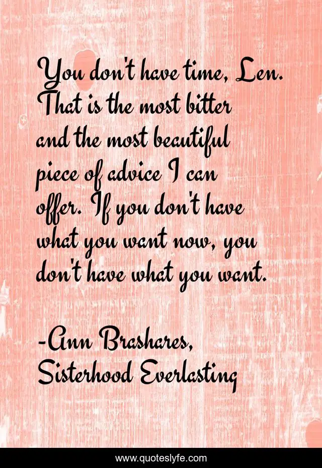 This page presents the quote "You don't have time, Len. That is the most bitter and the most beautiful piece of advice I can offer. If you don't have what you want now, you don't have what you want.". Author of this quote is Ann Brashares, Sisterhood Everlasting. This quote is about time-passing, time,.