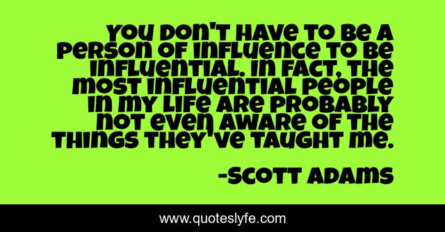 This page presents the quote "You don't have to be a person of influence to be influential. In fact, the most influential people in my life are probably not even aware of the things they've taught me.". Author of this quote is Scott Adams. This quote is about influential, influence,.