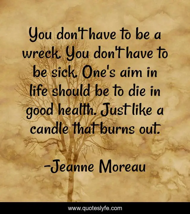 This page presents the quote "You don't have to be a wreck. You don't have to be sick. One's aim in life should be to die in good health. Just like a candle that burns out.". Author of this quote is Jeanne Moreau. This quote is about good health, life, good,.