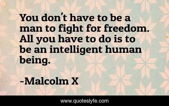 This page presents the quote "You don't have to be a man to fight for freedom. All you have to do is to be an intelligent human being.". Author of this quote is Malcolm X. This quote is about man, intelligent, fight,.