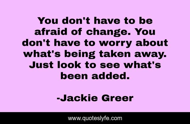 This page presents the quote "You don't have to be afraid of change. You don't have to worry about what's being taken away. Just look to see what's been added.". Author of this quote is Jackie Greer. This quote is about positive, confidence, creating, change,.