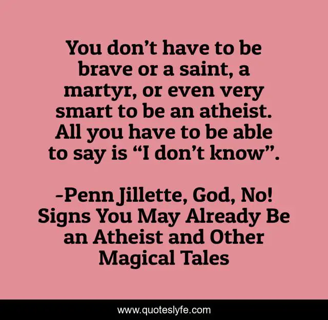 This page presents the quote "You don’t have to be brave or a saint, a martyr, or even very smart to be an atheist. All you have to be able to say is “I don’t know”.". Author of this quote is Penn Jillette, God, No! Signs You May Already Be an Atheist and Other Magical Tales. This quote is about atheism, agnosticism,.