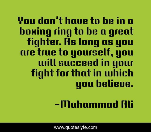 This page presents the quote "You don’t have to be in a boxing ring to be a great fighter. As long as you are true to yourself, you will succeed in your fight for that in which you believe.". Author of this quote is Muhammad Ali. This quote is about motivation, boxing, positive, motivational, confidence, happiness, inspirational, enthusiasm, achievement,.