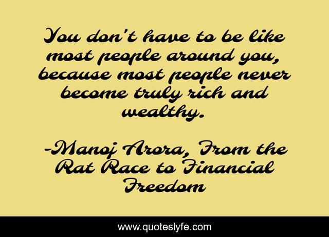 This page presents the quote "You don't have to be like most people around you, because most people never become truly rich and wealthy.". Author of this quote is Manoj Arora, From the Rat Race to Financial Freedom. This quote is about wealth, finance, rich, wealthy,.