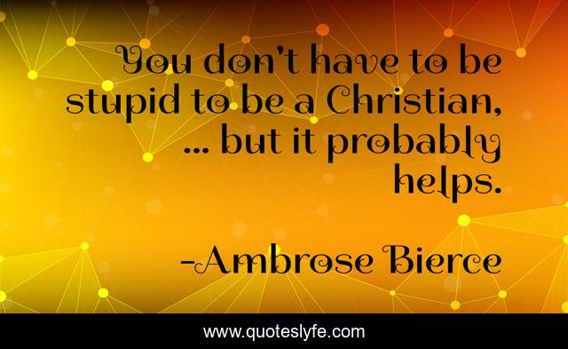 This page presents the quote "You don't have to be stupid to be a Christian, ... but it probably helps.". Author of this quote is Ambrose Bierce. This quote is about enthusiasm, inspirational,.
