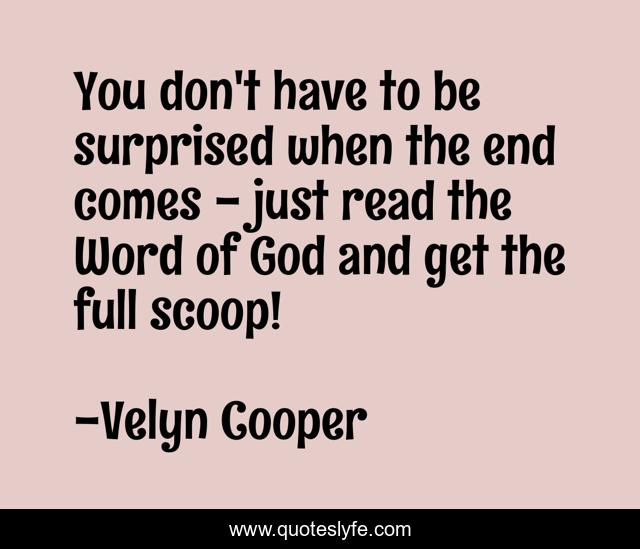 This page presents the quote "You don't have to be surprised when the end comes - just read the Word of God and get the full scoop!". Author of this quote is Velyn Cooper. This quote is about scoop, end, word-of-god, surprise,.