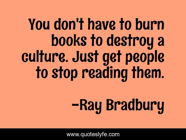 This page presents the quote "You don't have to burn books to destroy a culture. Just get people to stop reading them.". Author of this quote is Ray Bradbury. This quote is about culture, reading,.