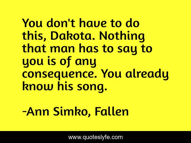 This page presents the quote "You don't have to do this, Dakota. Nothing that man has to say to you is of any consequence. You already know his song.". Author of this quote is Ann Simko, Fallen. .