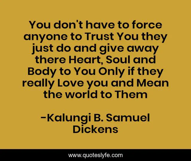 This page presents the quote "You don't have to force anyone to Trust You they just do and give away there Heart, Soul and Body to You Only if they really Love you and Mean the world to Them". Author of this quote is Kalungi B. Samuel Dickens. This quote is about trust, love, affection,.