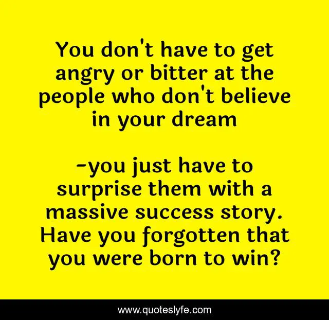 This page presents the quote "You don't have to get angry or bitter at the people who don't believe in your dream". Author of this quote is you just have to surprise them with a massive success story. Have you forgotten that you were born to win?. .