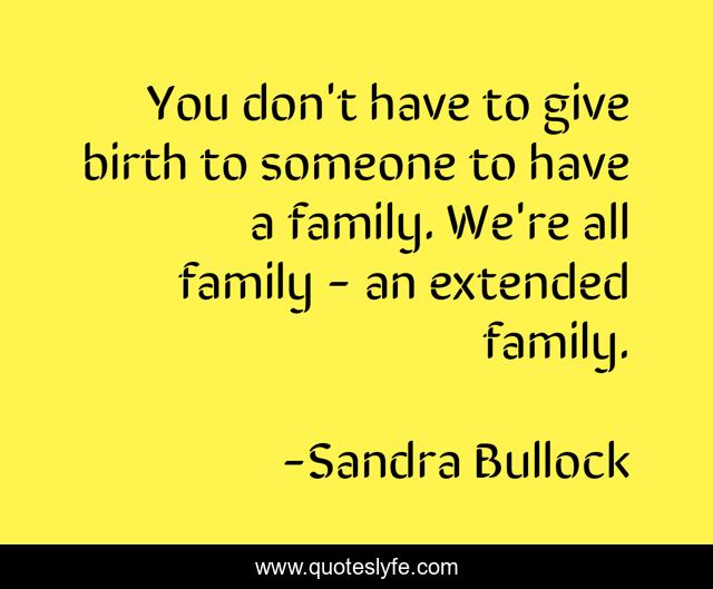 This page presents the quote "You don't have to give birth to someone to have a family. We're all family - an extended family.". Author of this quote is Sandra Bullock. This quote is about birth, give,.