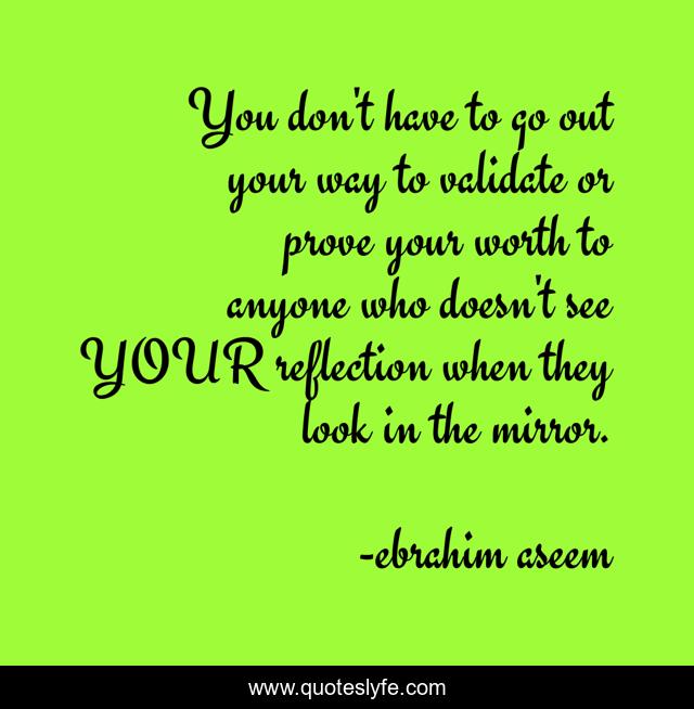 This page presents the quote "You don't have to go out your way to validate or prove your worth to anyone who doesn't see YOUR reflection when they look in the mirror.". Author of this quote is ebrahim aseem. This quote is about relationships, self-love, love, self-worth-qotd, affection,.