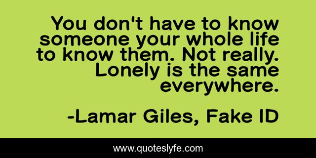 This page presents the quote "You don't have to know someone your whole life to know them. Not really. Lonely is the same everywhere.". Author of this quote is Lamar Giles, Fake ID. .