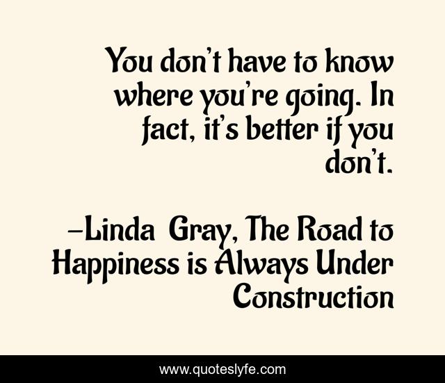 This page presents the quote "You don’t have to know where you’re going. In fact, it’s better if you don’t.". Author of this quote is Linda Gray, The Road to Happiness is Always Under Construction. This quote is about advice, inspiration, self-help,.