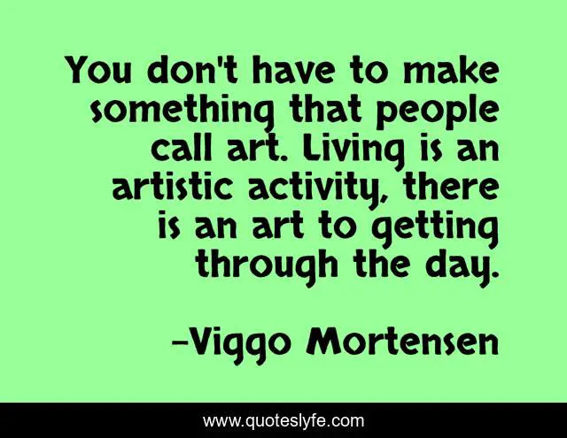 This page presents the quote "You don't have to make something that people call art. Living is an artistic activity, there is an art to getting through the day.". Author of this quote is Viggo Mortensen. This quote is about art, wisdom, humor, inspirational, fun, enthusiasm, cool,.