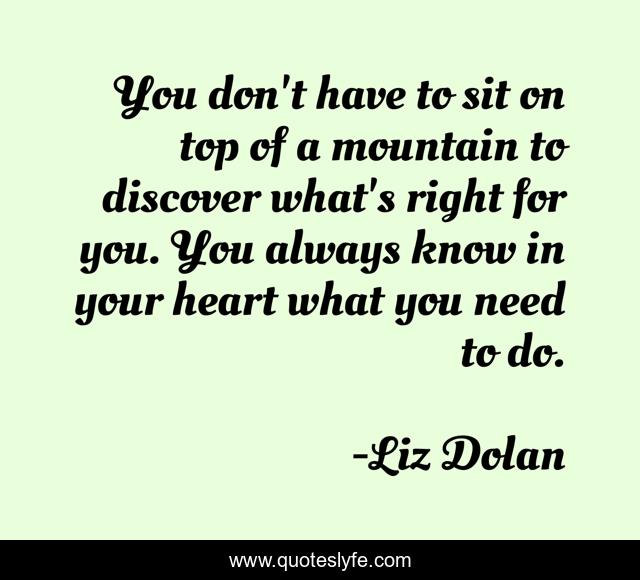 This page presents the quote "You don't have to sit on top of a mountain to discover what's right for you. You always know in your heart what you need to do.". Author of this quote is Liz Dolan. .
