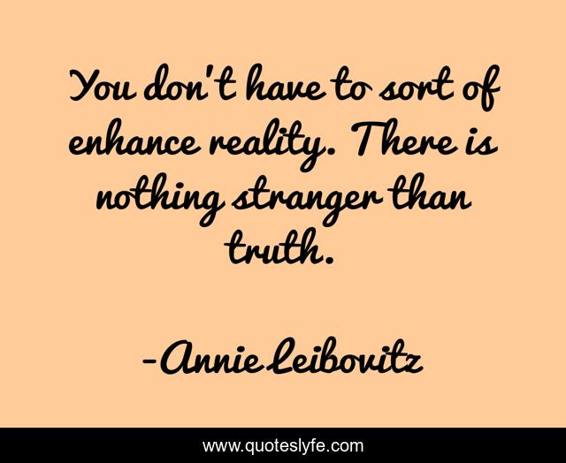 This page presents the quote "You don't have to sort of enhance reality. There is nothing stranger than truth.". Author of this quote is Annie Leibovitz. This quote is about stranger, reality,.