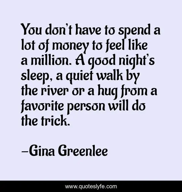 This page presents the quote "You don’t have to spend a lot of money to feel like a million. A good night’s sleep, a quiet walk by the river or a hug from a favorite person will do the trick.". Author of this quote is Gina Greenlee. This quote is about i-am-enough, worthiness, enoughness, self-love, self-worth, practicing-enough, inspirational, enthusiasm, self-worthiness,.