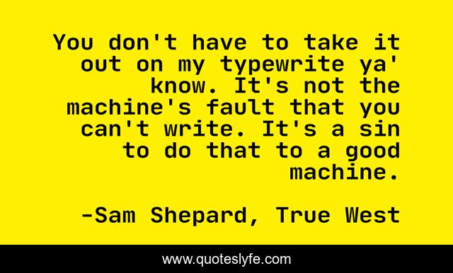 This page presents the quote "You don't have to take it out on my typewrite ya' know. It's not the machine's fault that you can't write. It's a sin to do that to a good machine.". Author of this quote is Sam Shepard, True West. This quote is about machine, writers-block, writers-on-writing, writing,.