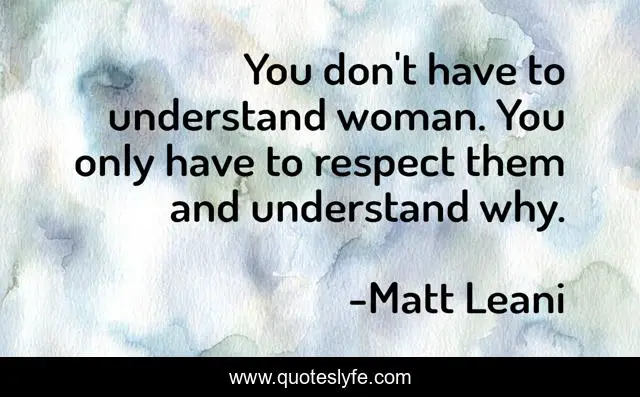 This page presents the quote "You don't have to understand woman. You only have to respect them and understand why.". Author of this quote is Matt Leani. This quote is about respecting-others, struggle, inner-peace, women,.