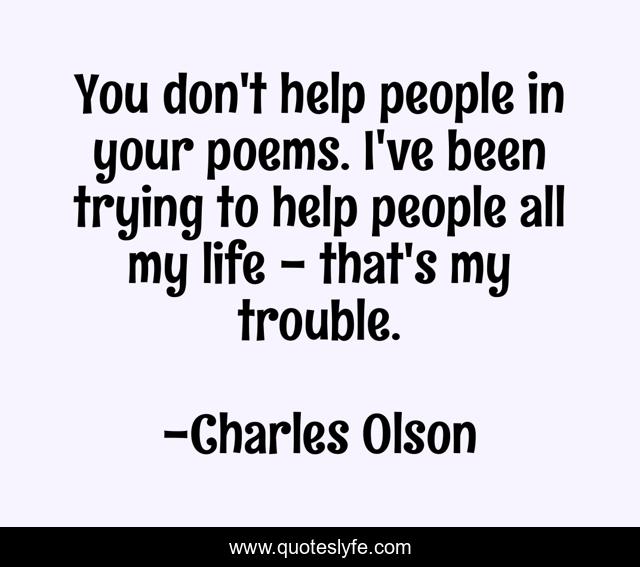 This page presents the quote "You don't help people in your poems. I've been trying to help people all my life - that's my trouble.". Author of this quote is Charles Olson. This quote is about life, help, people,.