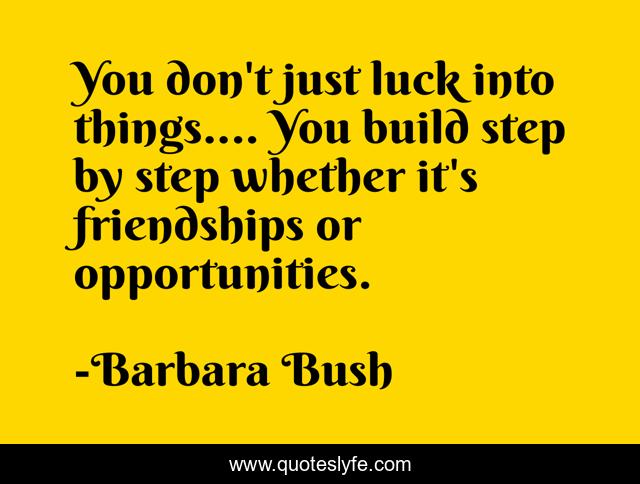 This page presents the quote "You don't just luck into things.... You build step by step whether it's friendships or opportunities.". Author of this quote is Barbara Bush. .