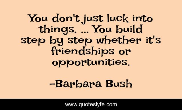 This page presents the quote "You don't just luck into things. ... You build step by step whether it's friendships or opportunities.". Author of this quote is Barbara Bush. .