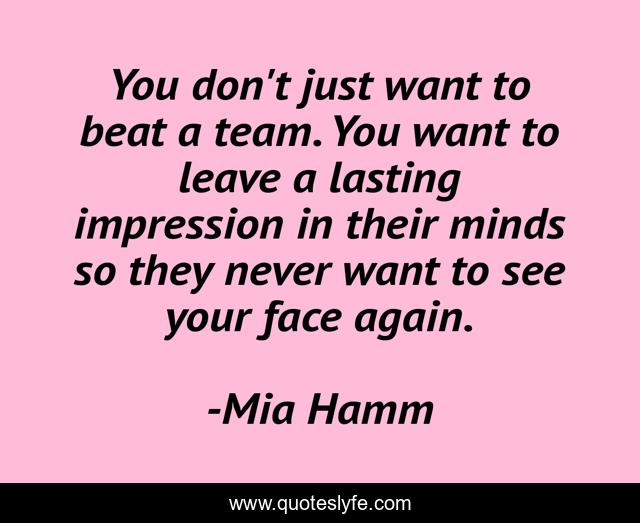 This page presents the quote "You don't just want to beat a team. You want to leave a lasting impression in their minds so they never want to see your face again.". Author of this quote is Mia Hamm. .