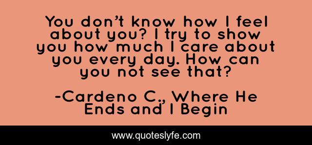 This page presents the quote "You don’t know how I feel about you? I try to show you how much I care about you every day. How can you not see that?". Author of this quote is Cardeno C., Where He Ends and I Begin. This quote is about love, affection, feelings,.