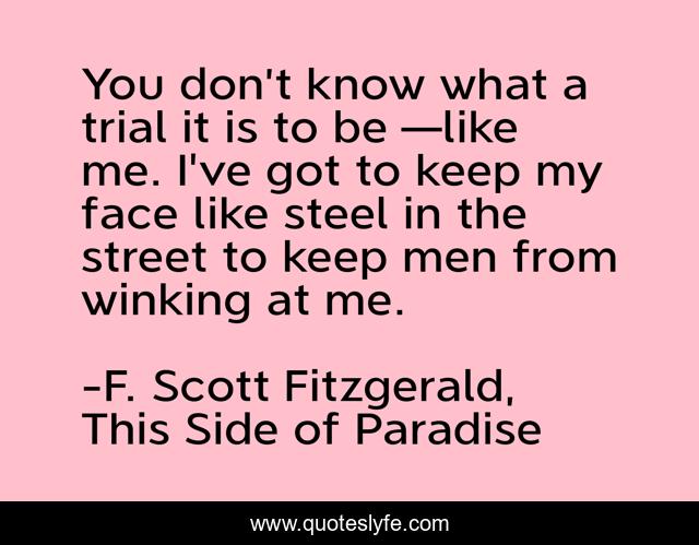 This page presents the quote "You don’t know what a trial it is to be —like me. I've got to keep my face like steel in the street to keep men from winking at me.". Author of this quote is F. Scott Fitzgerald, This Side of Paradise. This quote is about steel, curse, beauty, pretty-girls, trial, rosalind-connage,.