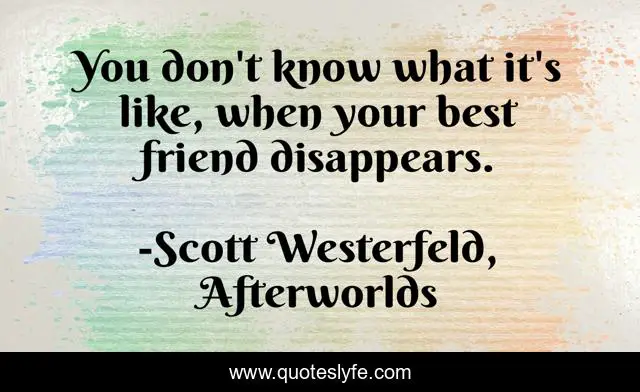 This page presents the quote "You don't know what it's like, when your best friend disappears.". Author of this quote is Scott Westerfeld, Afterworlds. This quote is about alone, sadness, friendship, best-friends,.