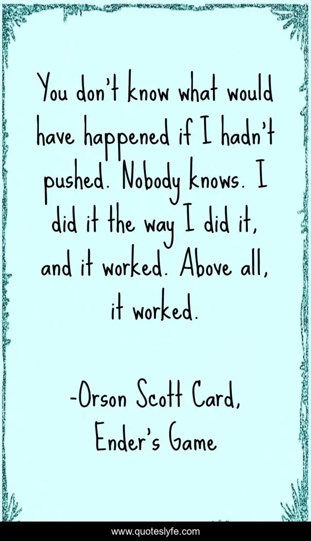 This page presents the quote "You don't know what would have happened if I hadn't pushed. Nobody knows. I did it the way I did it, and it worked. Above all, it worked.". Author of this quote is Orson Scott Card, Ender's Game. This quote is about life, love, ender, awesome, crazy, genius, push, affection,.
