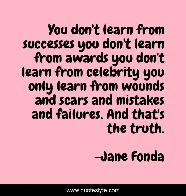 This page presents the quote "You don't learn from successes you don't learn from awards you don't learn from celebrity you only learn from wounds and scars and mistakes and failures. And that's the truth.". Author of this quote is Jane Fonda. This quote is about mistakes, learn,.