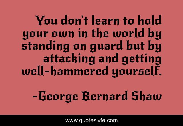 This page presents the quote "You don't learn to hold your own in the world by standing on guard but by attacking and getting well-hammered yourself.". Author of this quote is George Bernard Shaw. .