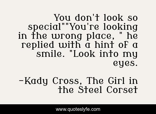 This page presents the quote "You don't look so special""You're looking in the wrong place, " he replied with a hint of a smile. "Look into my eyes.". Author of this quote is Kady Cross, The Girl in the Steel Corset. This quote is about cute, griffin, finley,.